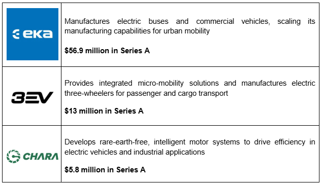 In the Mobility sector, EKA Mobility spearheaded the capital inflow with a $56.9 million round, demonstrating a persistent belief in OEM expansion. Beyond OEMs, the ecosystem continues to diversify into infrastructure and components, evidenced by 3ev and Chara Technologies, the latter focusing on deep-tech motor solutions.