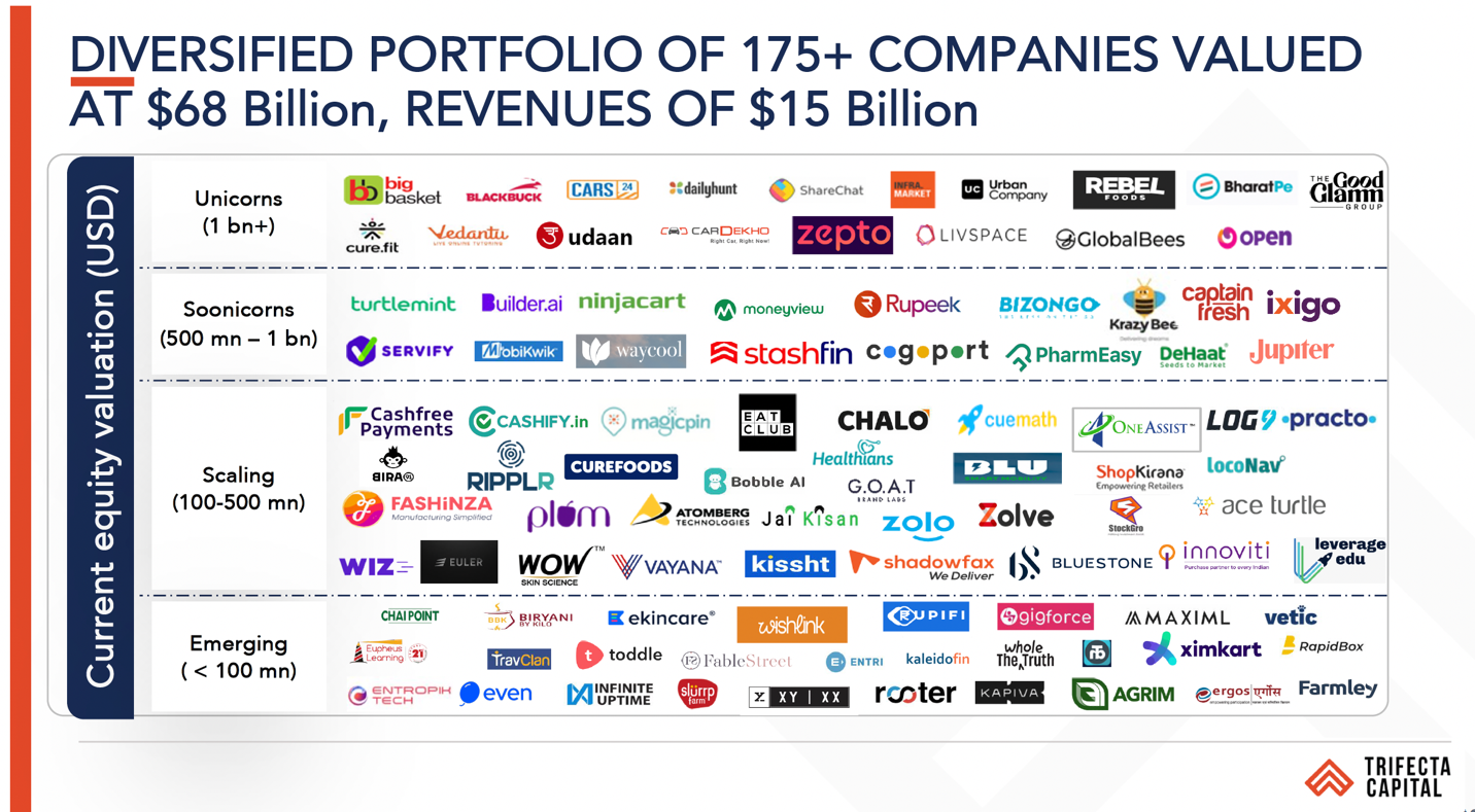 Trifecta’s portfolio serves Bharat, the heart of India. Trifecta portfolio companies deliver accessible and affordable products and services to over 25 countries, in addition to India. At the same time, Trifecta is an index to India’s new economy, reflected in our diverse portfolio of nearly 200 companies.