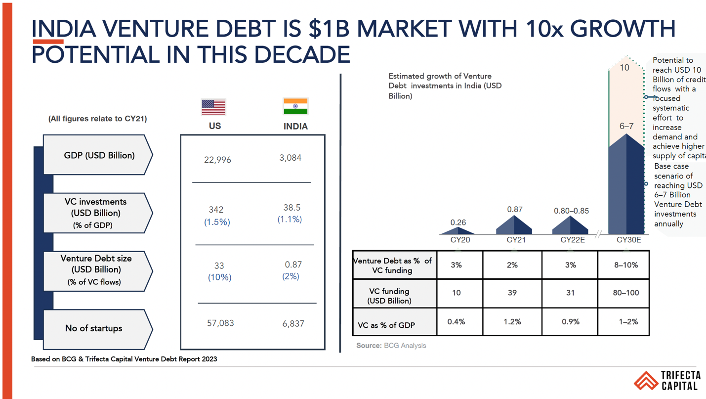 Venture debt as an asset class has surpassed the $1B per annum mark in recent years. While it constitutes nearly 20% of venture capital deployed in the US, it accounts for less than 5% in India, underscoring its untapped growth potential.
