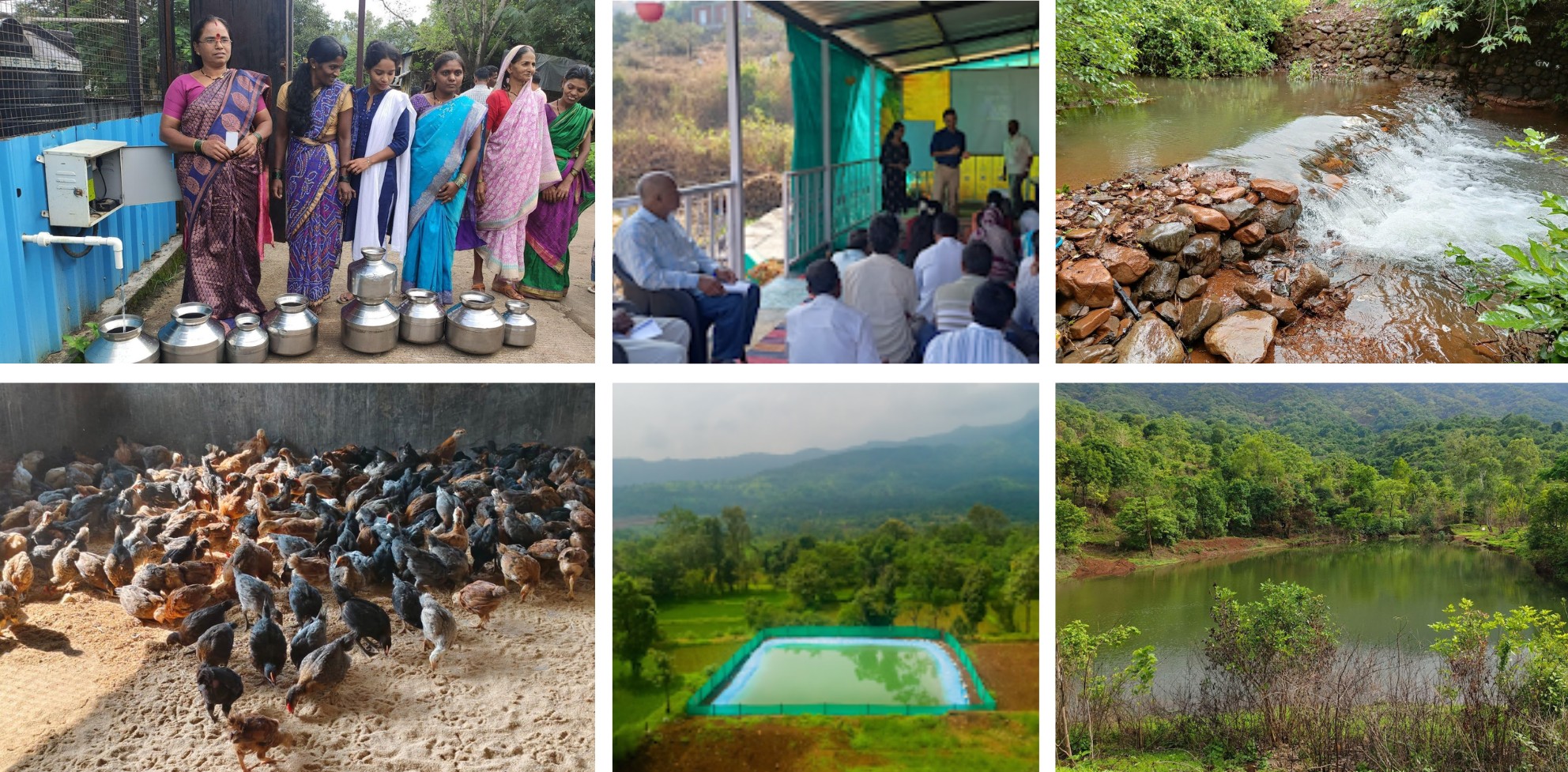 These images reflect Raintree Foundation’s integrated approach in the Northern Western Ghats: solar-powered water ATMs providing clean drinking water, rainwater-harvesting farm ponds supporting agriculture and horticulture, village biodiversity management committees strengthened through training and capacity building, livelihood initiatives like backyard poultry, and soil- and water-conservation structures, including percolation tanks, that have helped recharge groundwater and revive wells, showing how community-led solutions build long-term resilience.